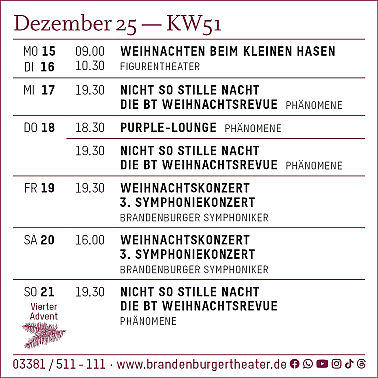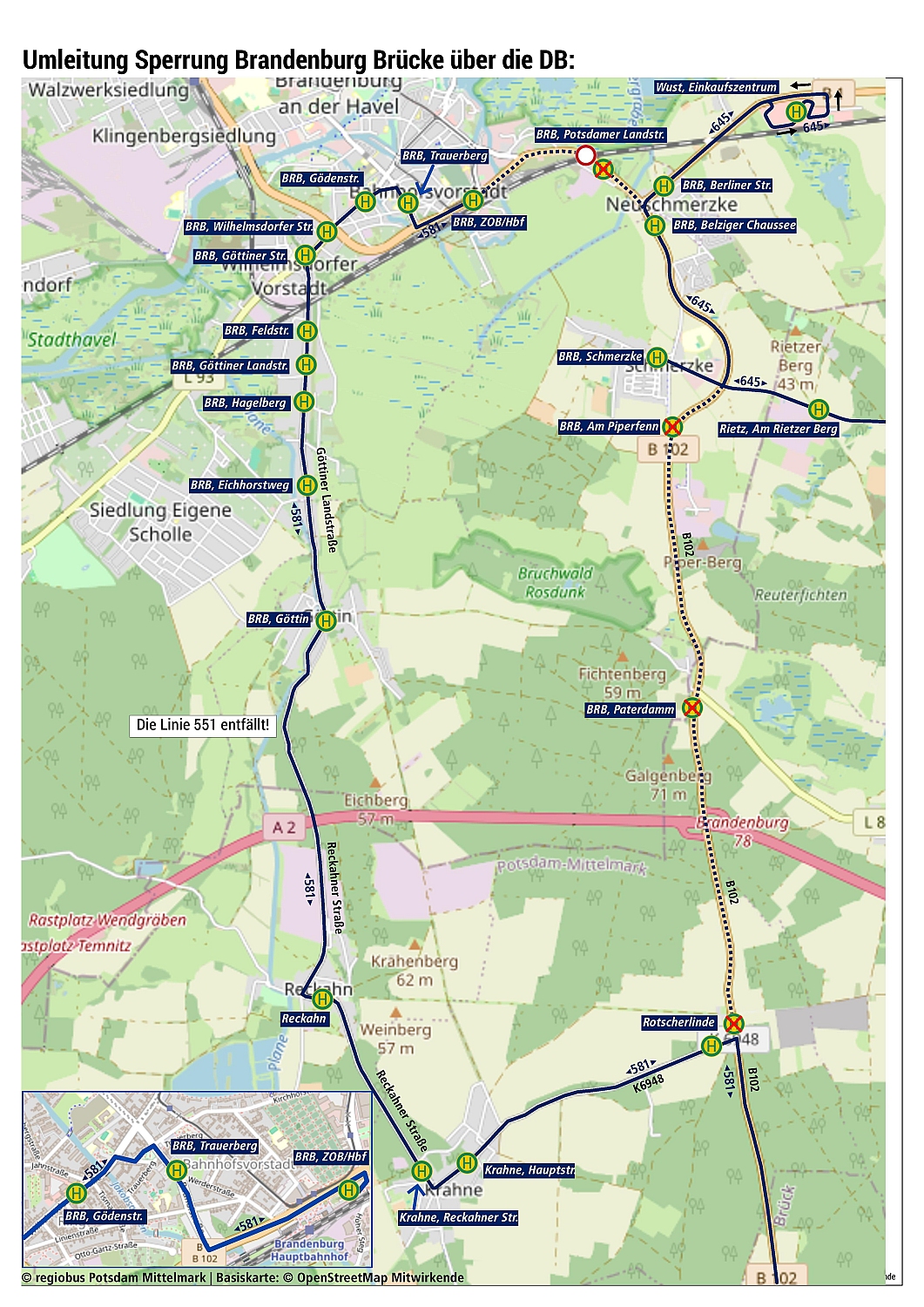 Wegen Bauarbeiten wird die Brücke über die Bahnanlagen in der Potsdamer Straße in Brandenburg an der Havel vollständig gesperrt. Die Sperrung gilt von Freitag, 19. Dezember, 18 Uhr, bis Montag, 22. Dezember, 4 Uhr. Betroffen sind die Linien 551, 554, 581 und 645. Da auch der Parkplatz am Schützenworth nicht nutzbar ist, können die Fahrzeuge nicht wenden, wodurch die Ersatzhaltestelle am ZOB südlich der Bahn in diesem Zeitraum entfällt.