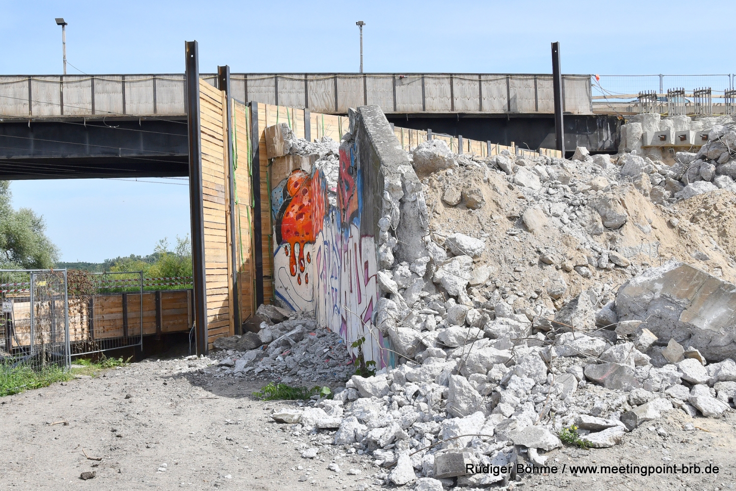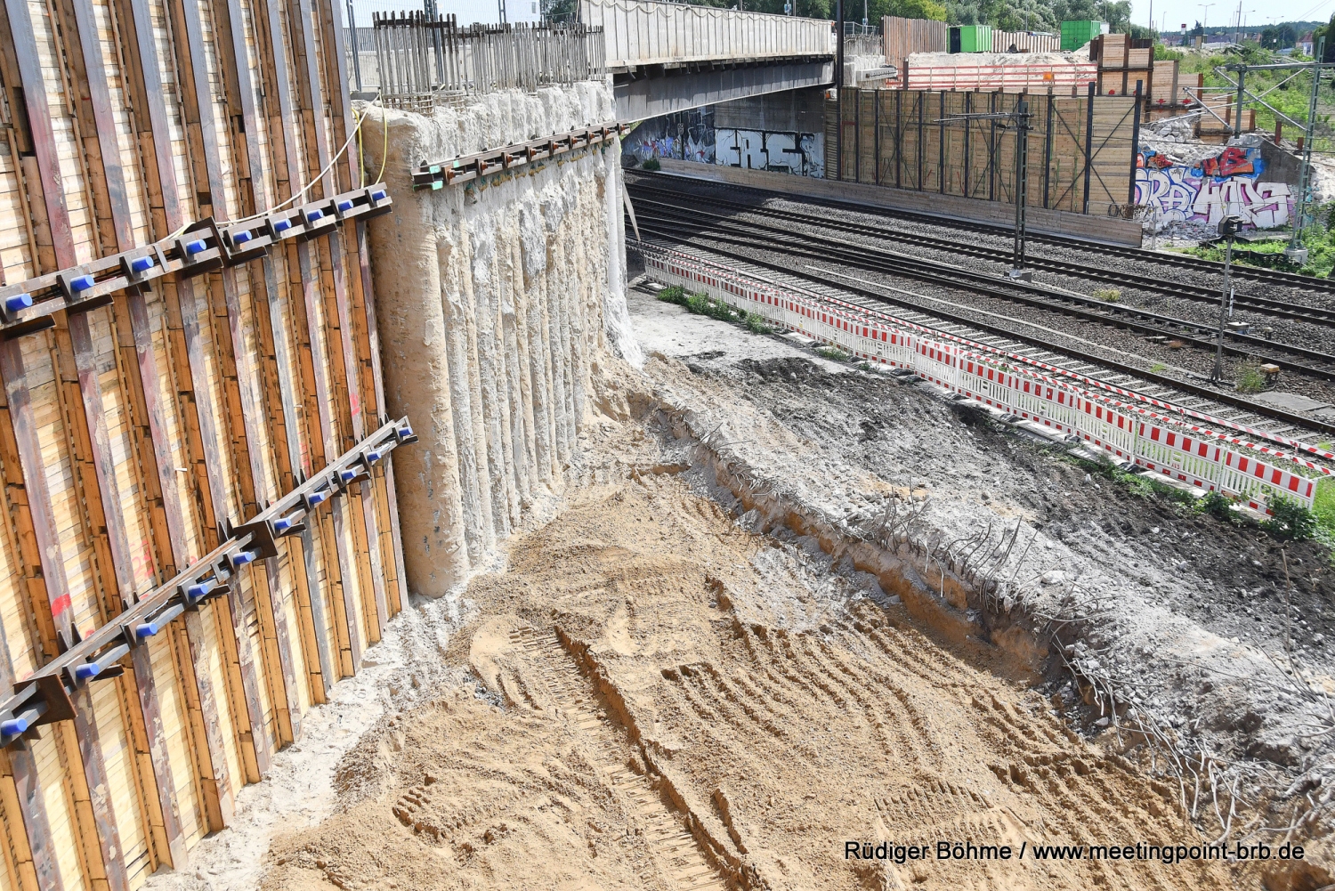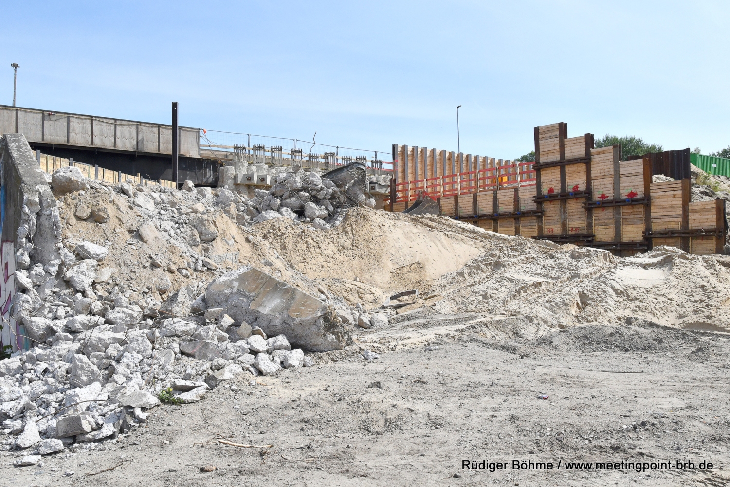 Die Bauarbeiten an der neuen Bahnbrücke in der Potsdamer Straße gehen planmäßig weiter, wie bei einem Vor-Ort-Besuch jetzt zu erfahren waren. Zwar kann man die Arbeiten wegen der hohen Sicherungswand, die auch ein Sichtschutz ist, nicht mehr so genau verfolgen, aber wie von Stefan Voß, von der Bauaufsicht des Landesbetriebes Straßenwesen Brandenburg (LS), gegenüber Meetingpoint berichtet wird, liegt man derzeit gut im Plan. Derweil ist fast unbemerkt das Widerlager auf der Stadtseite der alten stadtauswärts führenden Brücke abgerissen worden.