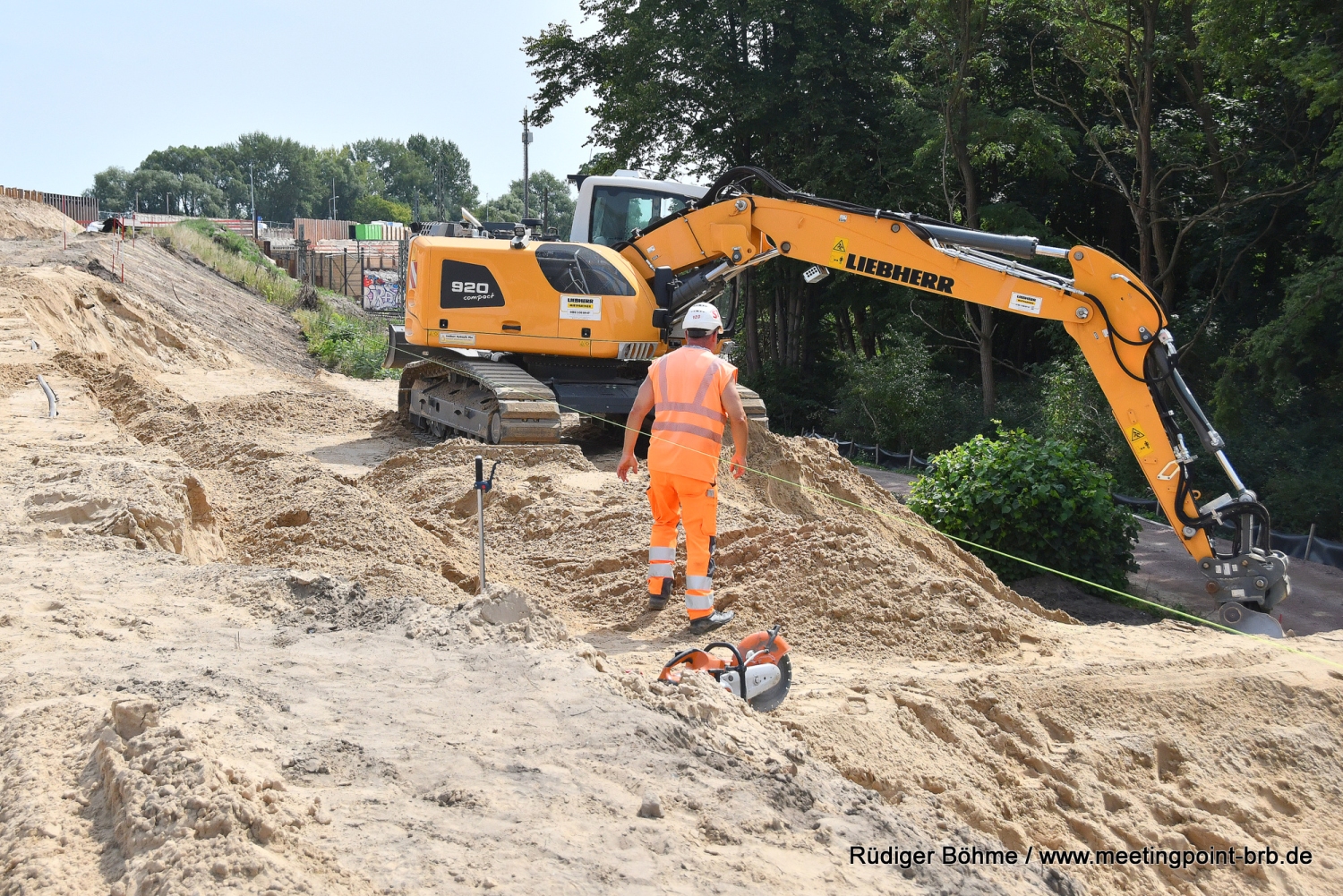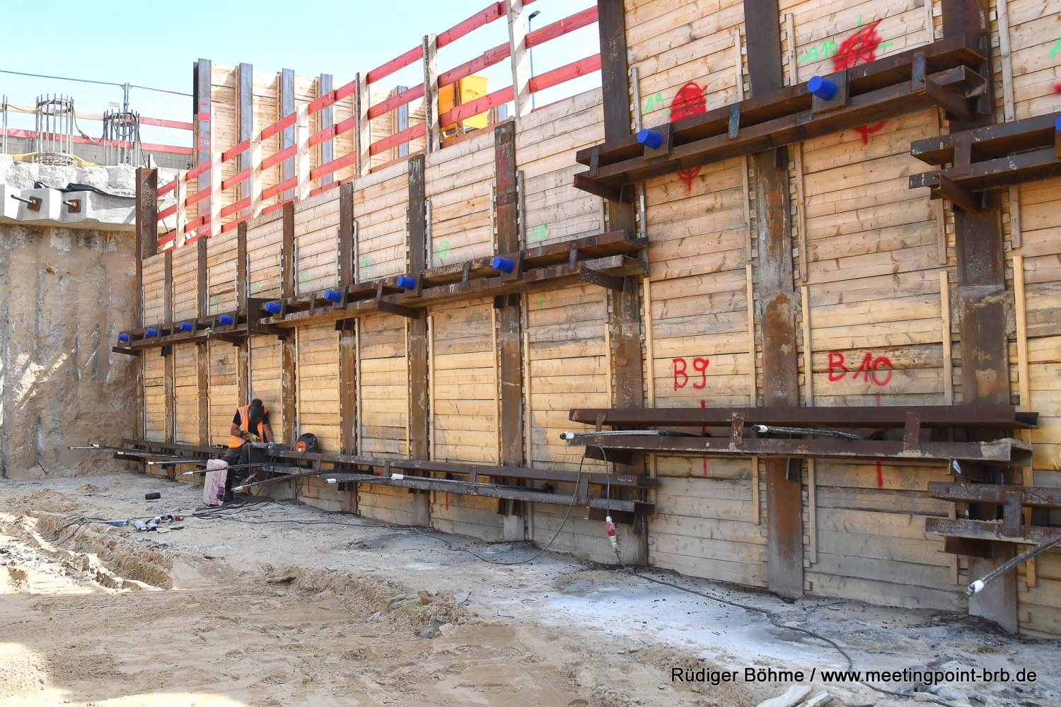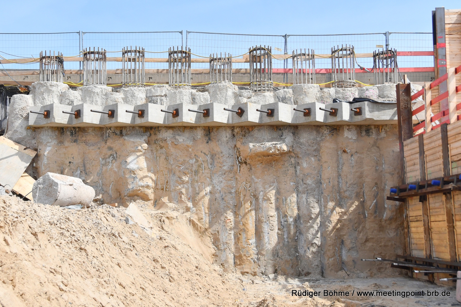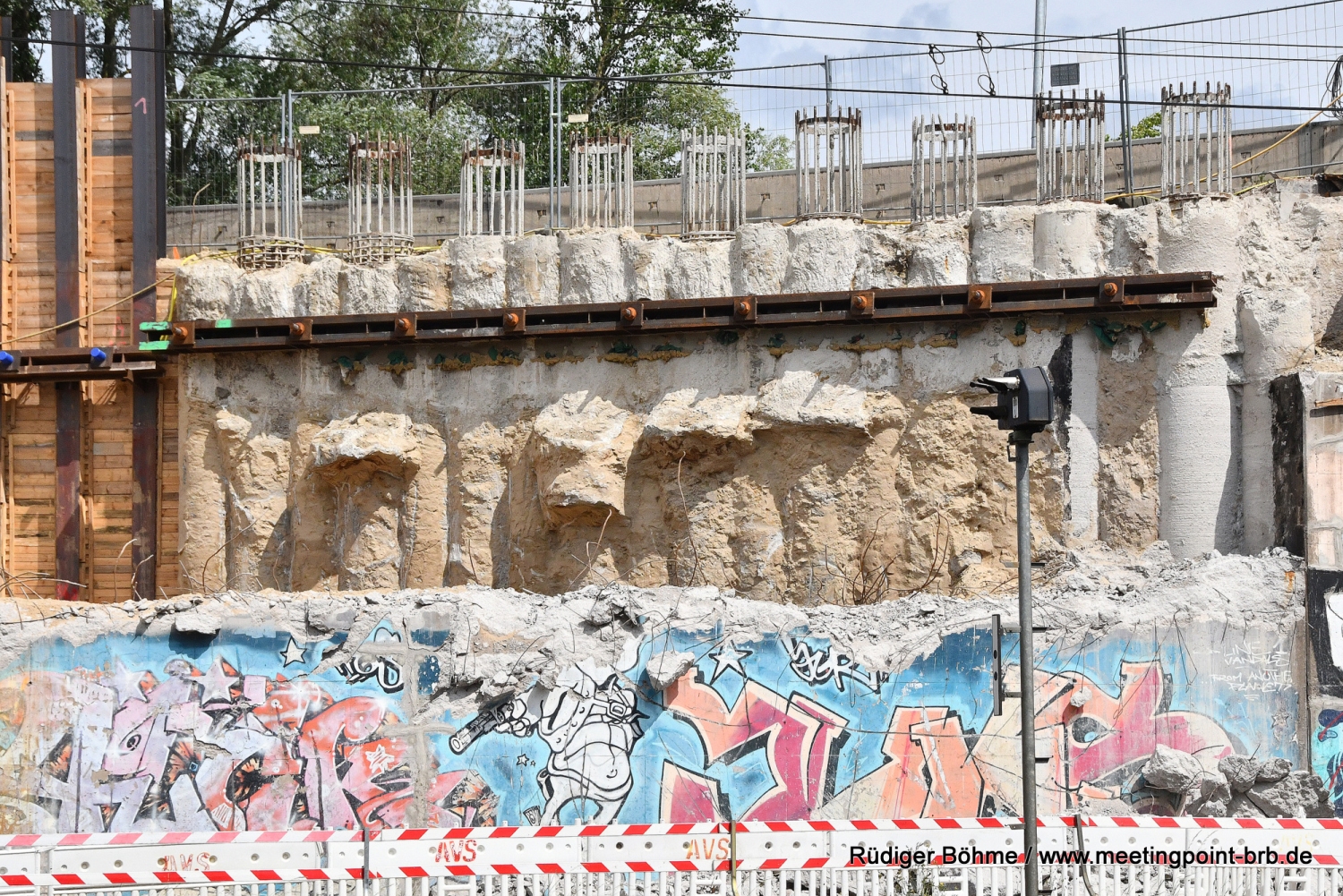 Die Bauarbeiten an der neuen Bahnbrücke in der Potsdamer Straße gehen planmäßig weiter, wie bei einem Vor-Ort-Besuch jetzt zu erfahren waren. Zwar kann man die Arbeiten wegen der hohen Sicherungswand, die auch ein Sichtschutz ist, nicht mehr so genau verfolgen, aber wie von Stefan Voß, von der Bauaufsicht des Landesbetriebes Straßenwesen Brandenburg (LS), gegenüber Meetingpoint berichtet wird, liegt man derzeit gut im Plan. Derweil ist fast unbemerkt das Widerlager auf der Stadtseite der alten stadtauswärts führenden Brücke abgerissen worden.