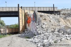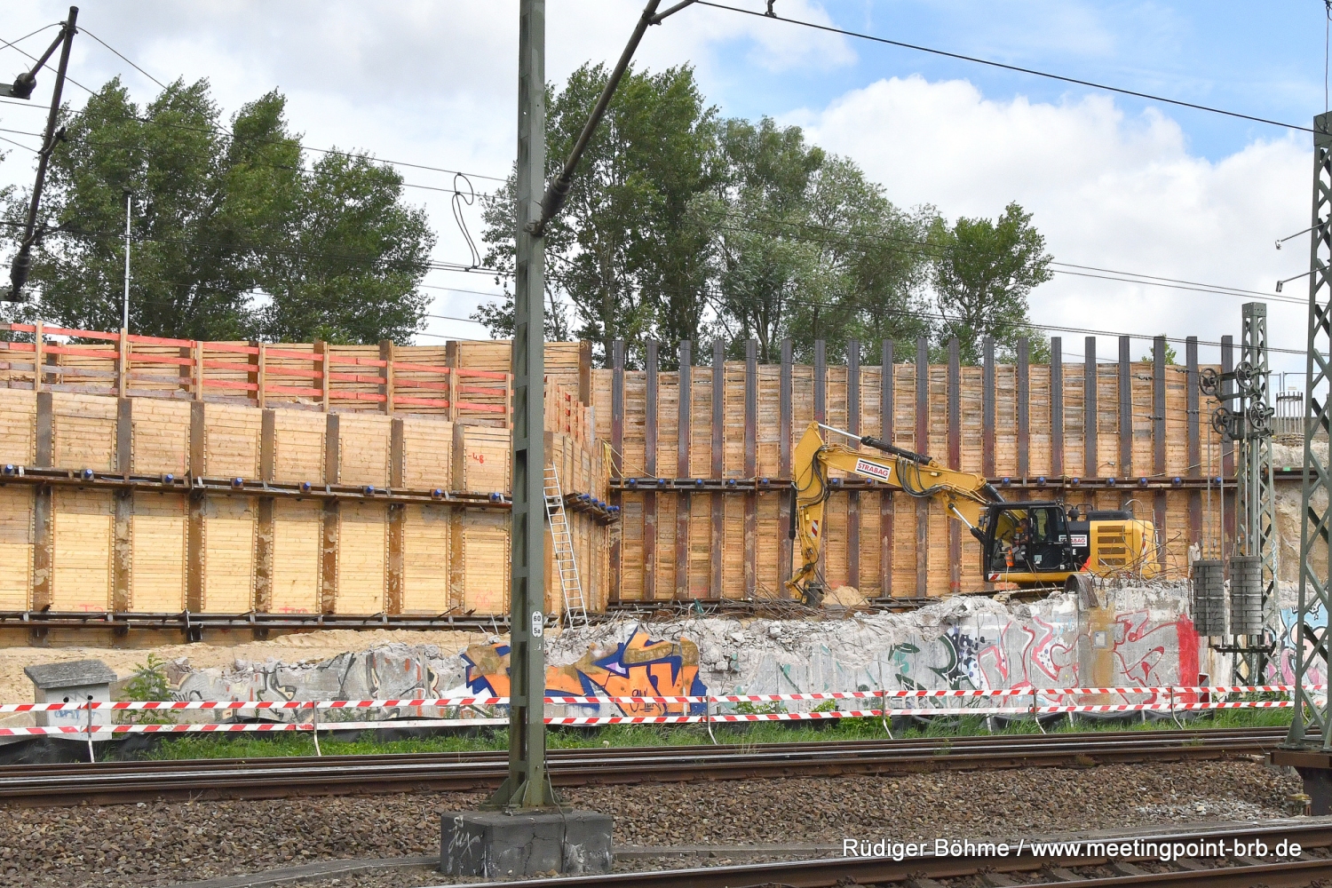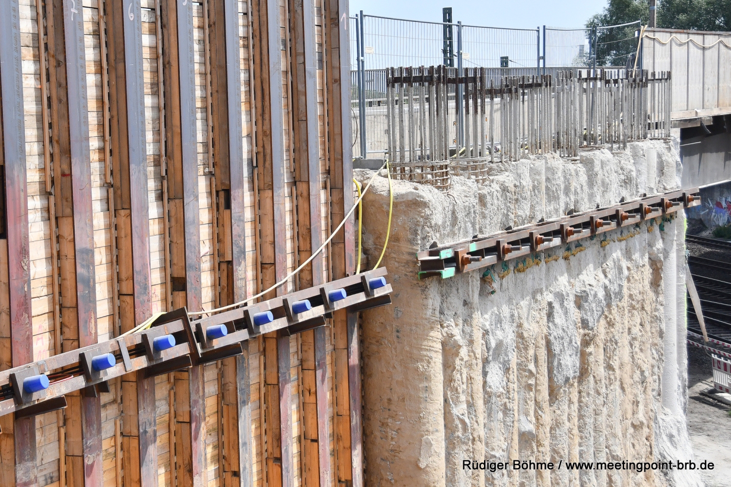 Etwas schwieriger und umfassender gestaltet sich der Abriss auf der gegenüberliegenden Seite. Hier musste aufgrund der Gleisnähe erst einmal eine Schutzwand errichtet werden. Die ist notwendig, damit beim Abriss keine Betonteile auf die Gleise fallen können. Für die Schutzwand musste zudem im Gleisbereich ein Teil der Schotterstrecke entfernt und das Gleis entsprechend gesichert werden. Hier sind die Bauarbeiten noch voll im Gange. Es werden noch Abrissarbeiten durchgeführt. Hinter dem alten Widerlager wurden bereits erste Vorarbeiten erledigt, so ist eine sogenannter Baubehelf, also ein Trägerwohlverbau, errichtet worden. Der ist wiederum mittels Verpressankern im Baugrund rückverankert, damit der Baubehelf nicht in die Baugrube kippt.