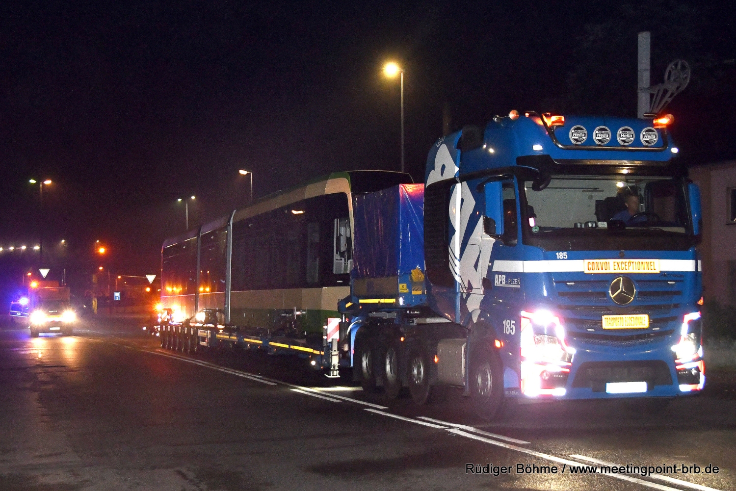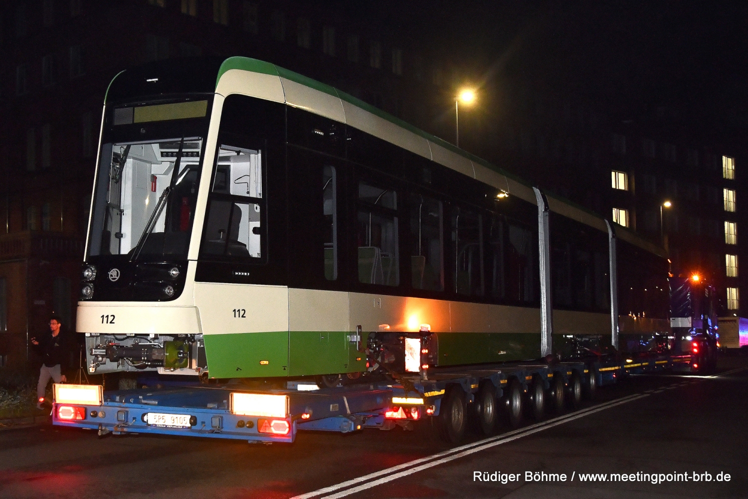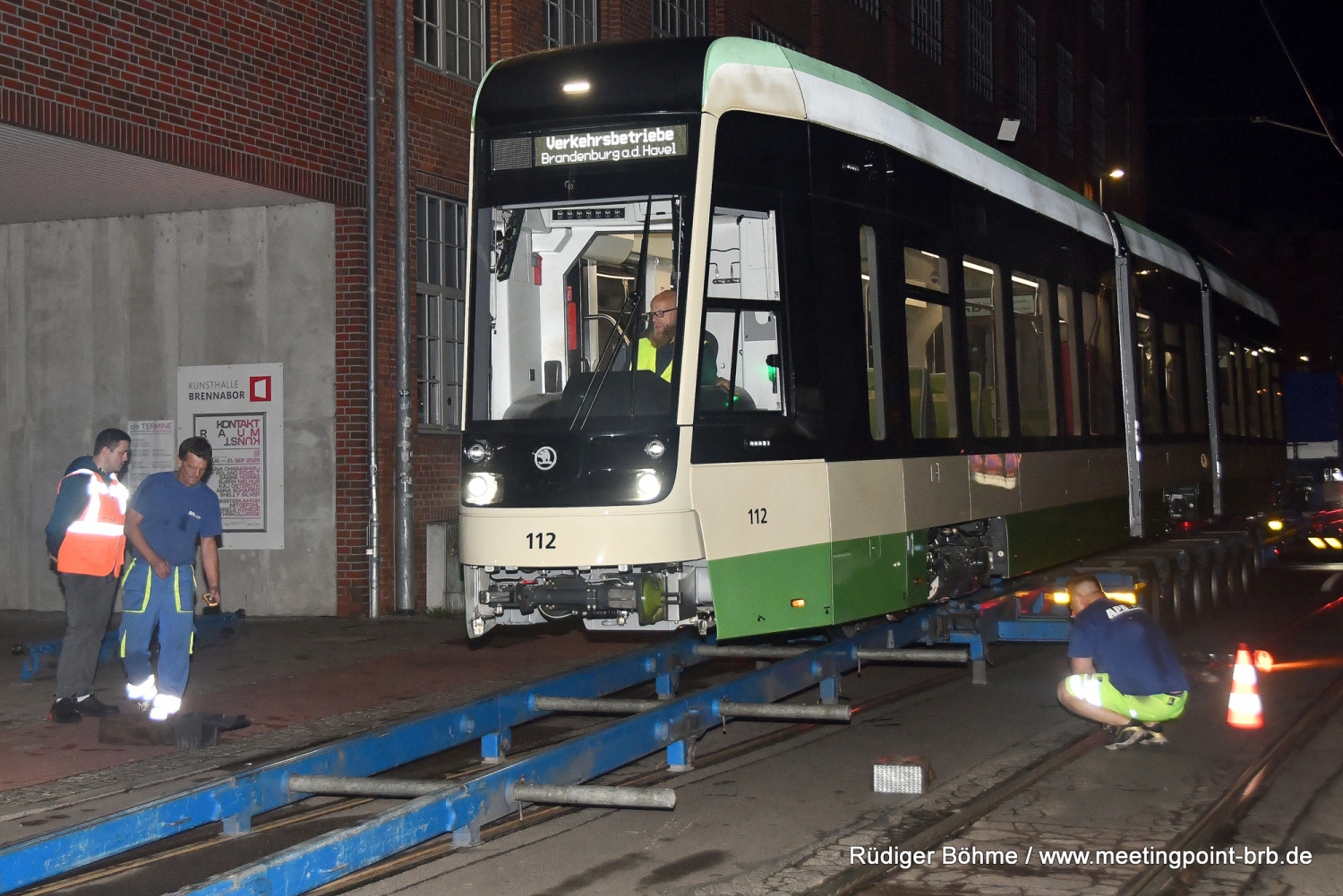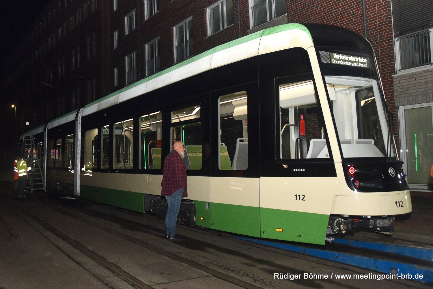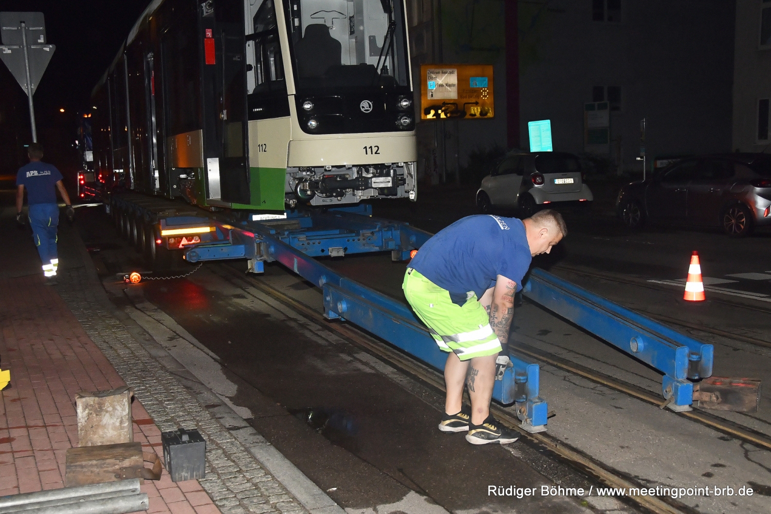 Heute Morgen, um 2:05 Uhr, bog der Schwerlasttransport mit der 3. Skoda-Straßenbahn von der Bundesstraße 1in die Geschwister-Scholl-Straße und ziemlich genau eine Stunde später stand die neue Skoda-Straßenbahn auf den Brandenburger Gleisen. Das ganze von gut einem Dutzend Straßenbahn-Enthusiasten beobachtet, fotografiert und gefilmt. Die meisten von ihnen waren bereits seit etwa Mitternacht in der Geschwister-Scholl-Straße und warteten auf den Transport, denn sie wollten die Ankunft und das Abladen der Tram auf keinen Fall verpassen.
