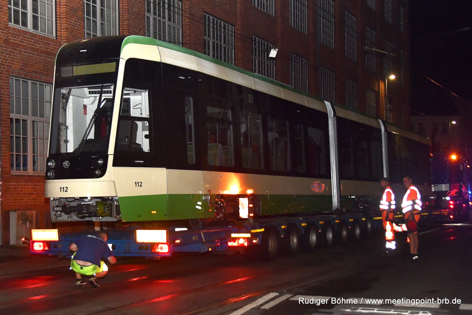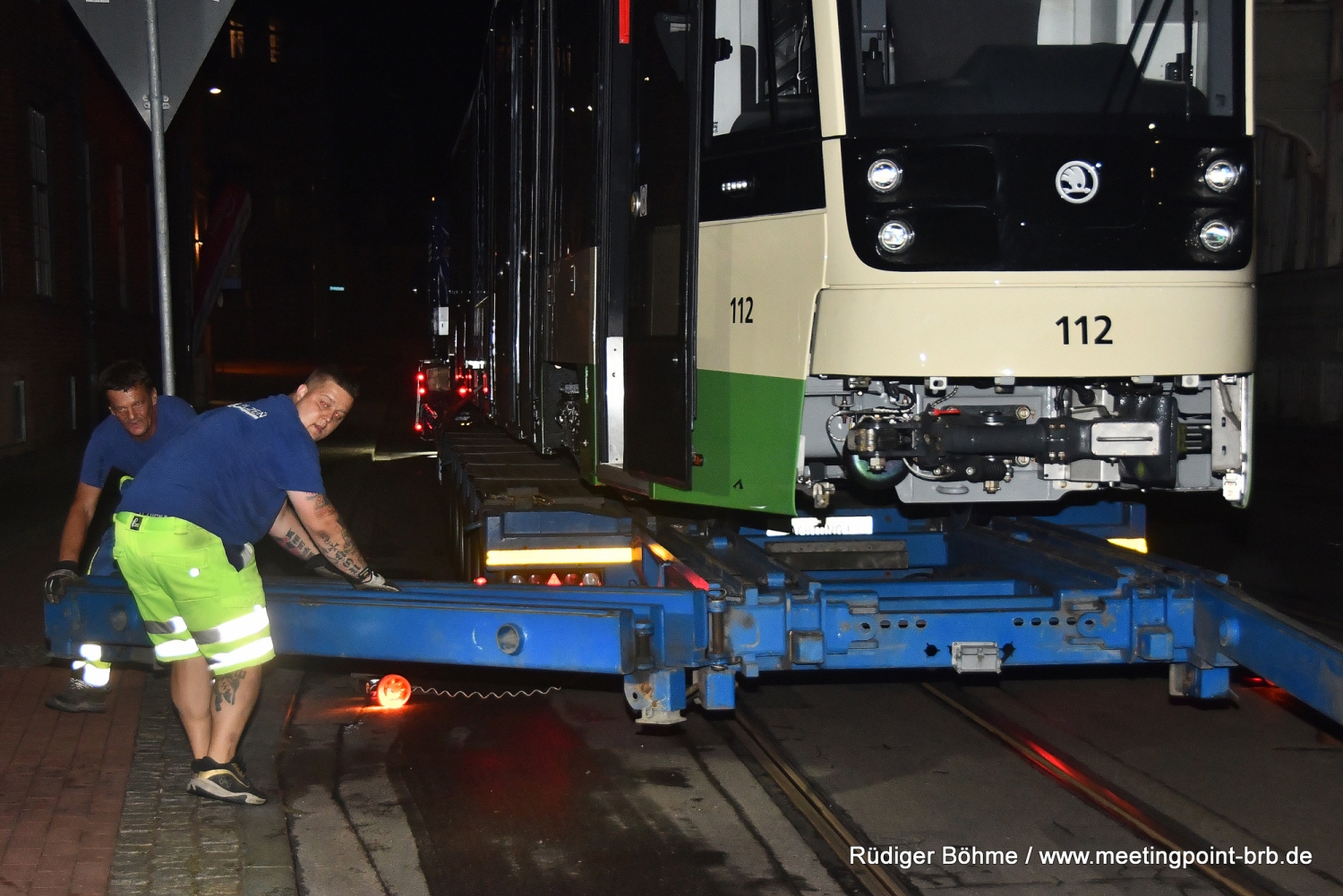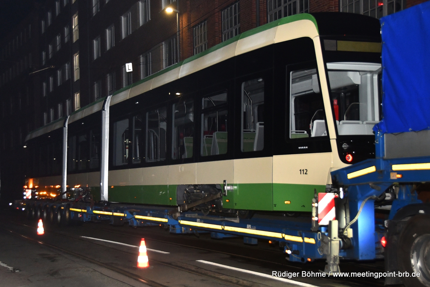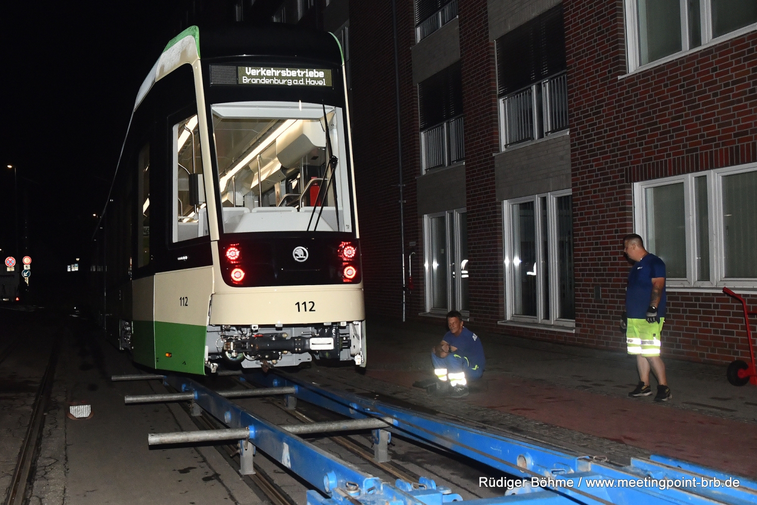 Heute Morgen, um 2:05 Uhr, bog der Schwerlasttransport mit der 3. Skoda-Straßenbahn von der Bundesstraße 1in die Geschwister-Scholl-Straße und ziemlich genau eine Stunde später stand die neue Skoda-Straßenbahn auf den Brandenburger Gleisen. Das ganze von gut einem Dutzend Straßenbahn-Enthusiasten beobachtet, fotografiert und gefilmt. Die meisten von ihnen waren bereits seit etwa Mitternacht in der Geschwister-Scholl-Straße und warteten auf den Transport, denn sie wollten die Ankunft und das Abladen der Tram auf keinen Fall verpassen.