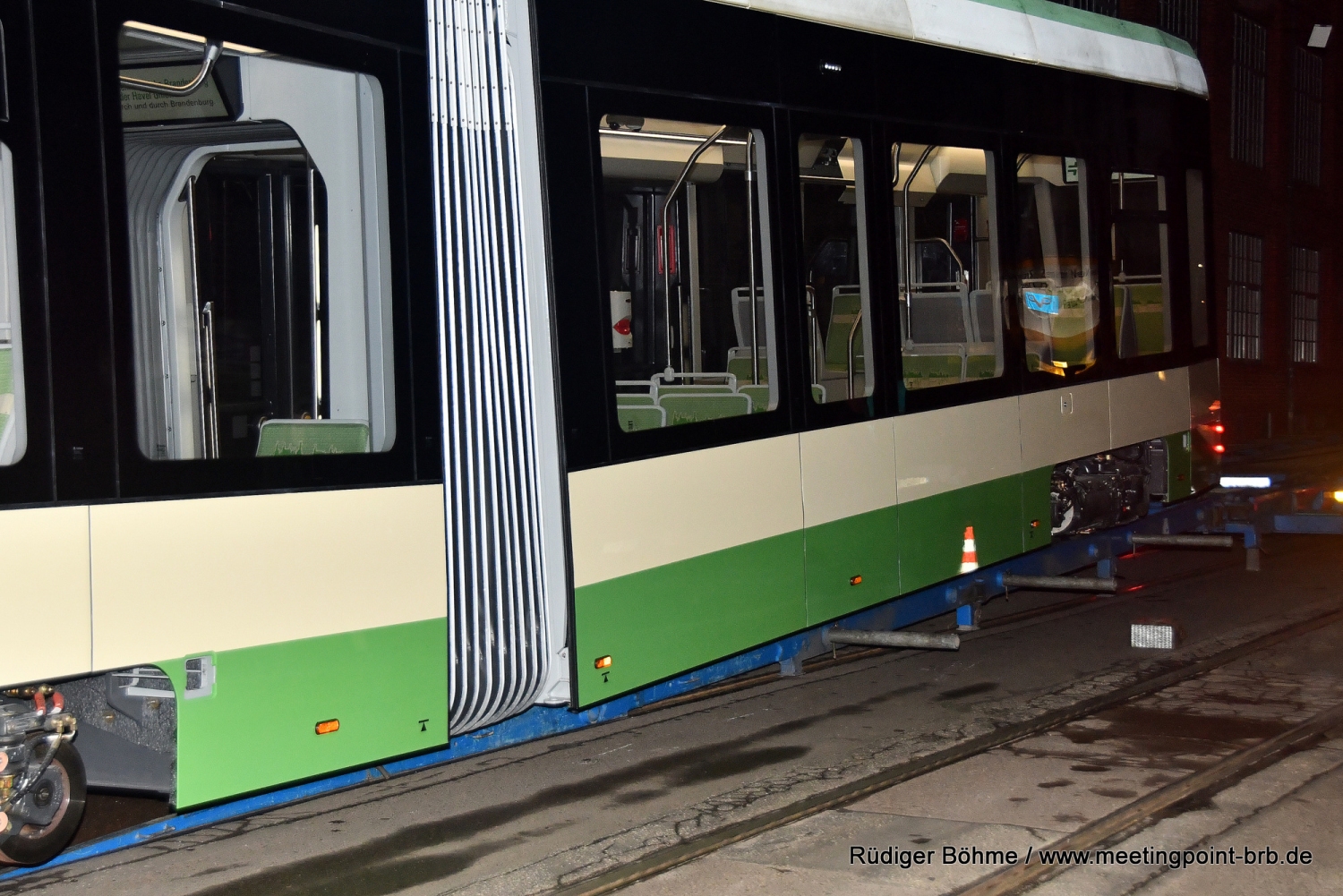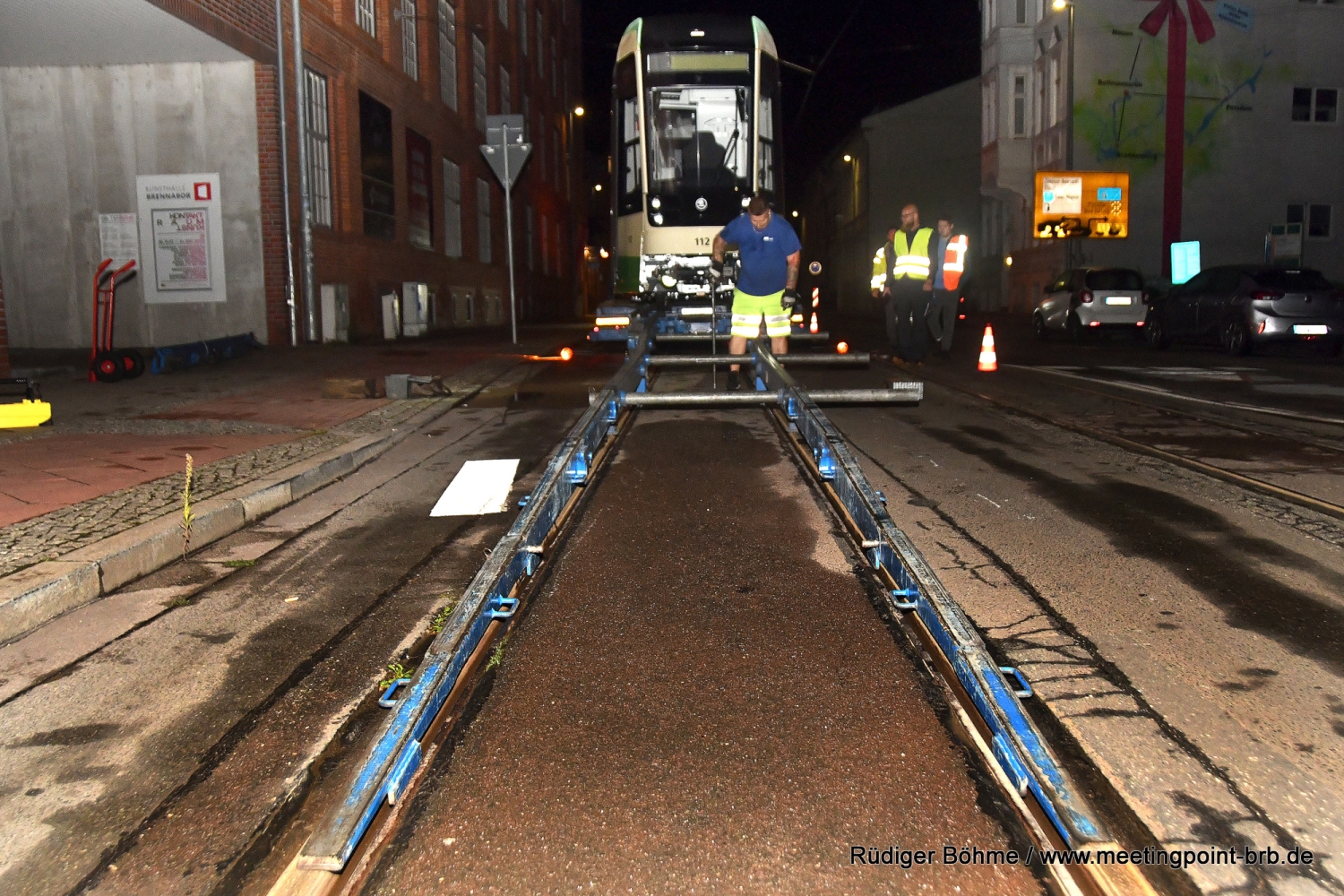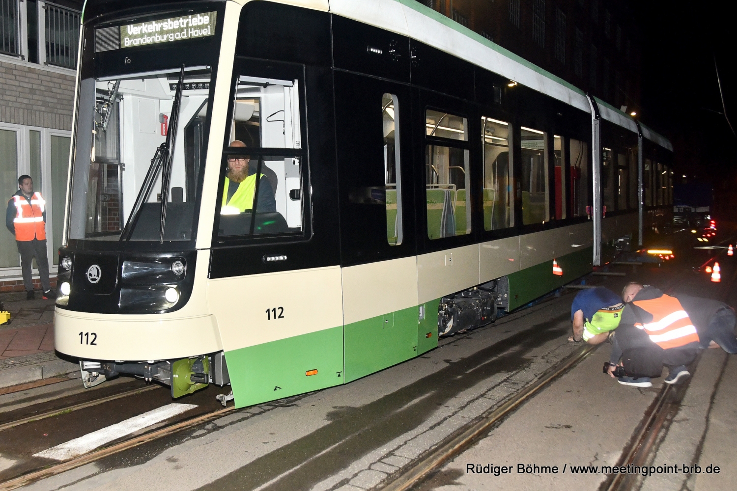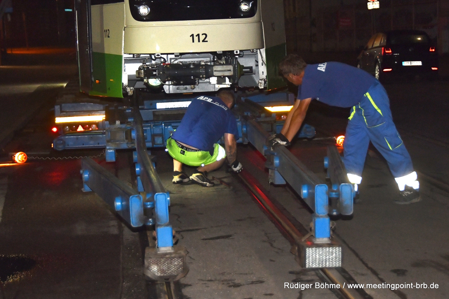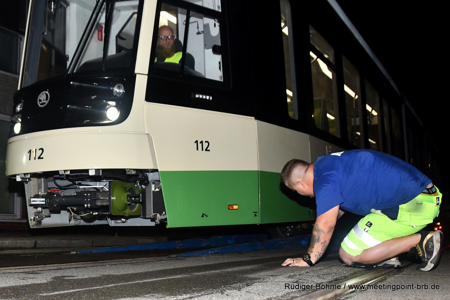 Heute Morgen, um 2:05 Uhr, bog der Schwerlasttransport mit der 3. Skoda-Straßenbahn von der Bundesstraße 1in die Geschwister-Scholl-Straße und ziemlich genau eine Stunde später stand die neue Skoda-Straßenbahn auf den Brandenburger Gleisen. Das ganze von gut einem Dutzend Straßenbahn-Enthusiasten beobachtet, fotografiert und gefilmt. Die meisten von ihnen waren bereits seit etwa Mitternacht in der Geschwister-Scholl-Straße und warteten auf den Transport, denn sie wollten die Ankunft und das Abladen der Tram auf keinen Fall verpassen.