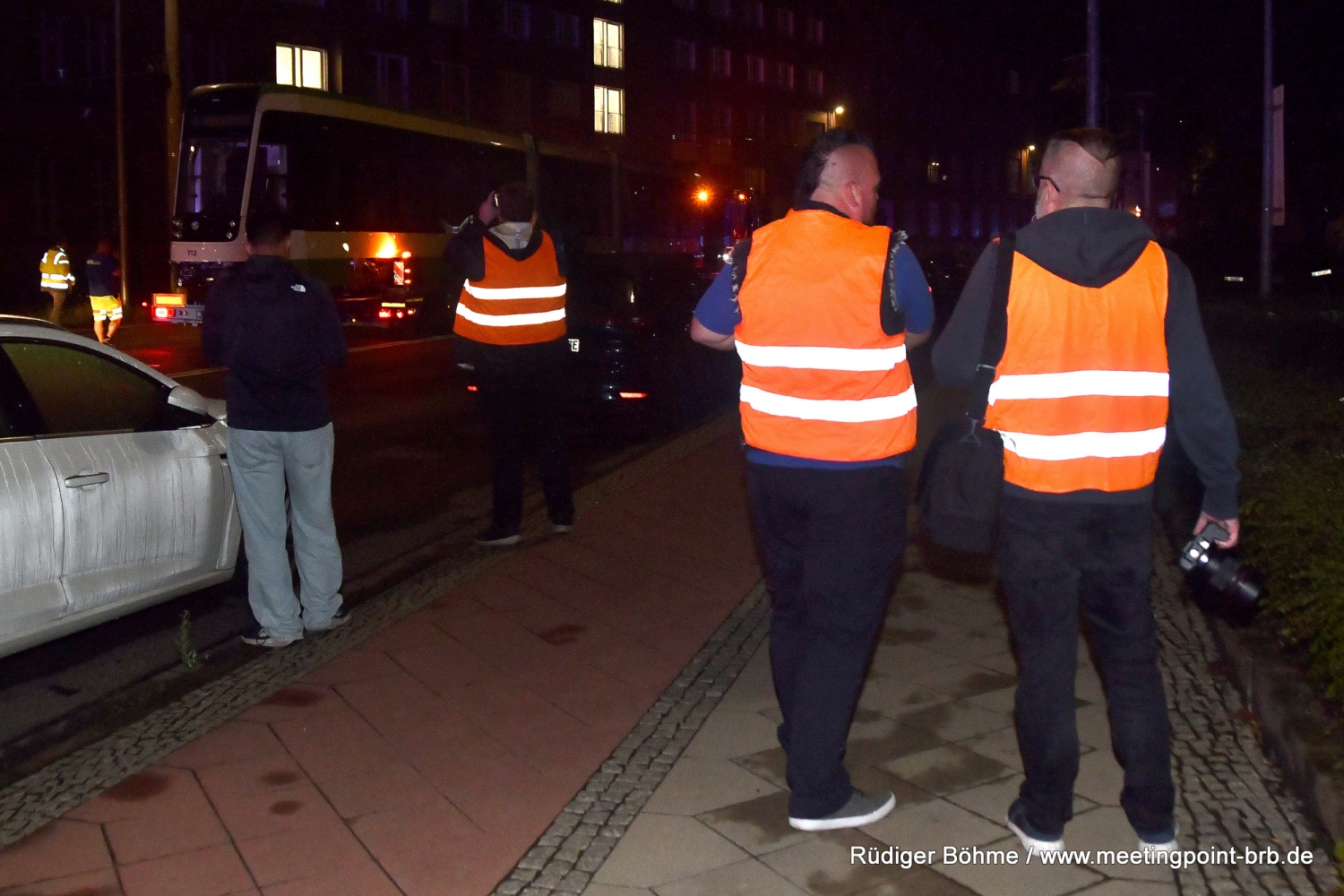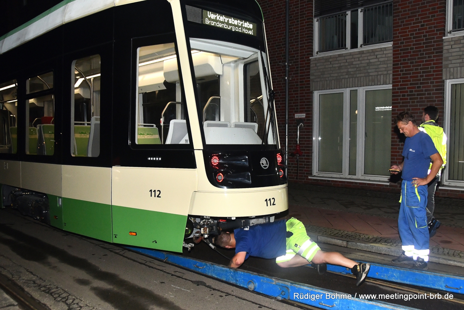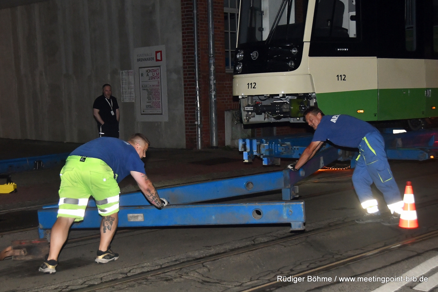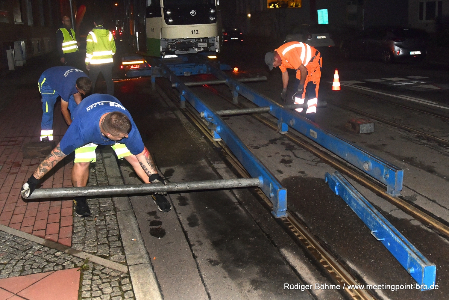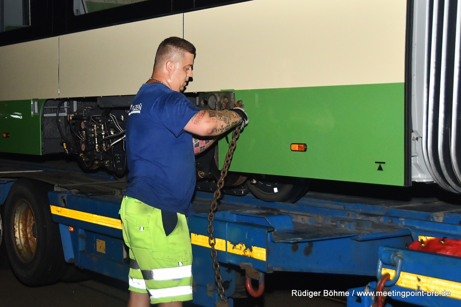 Heute Morgen, um 2:05 Uhr, bog der Schwerlasttransport mit der 3. Skoda-Straßenbahn von der Bundesstraße 1in die Geschwister-Scholl-Straße und ziemlich genau eine Stunde später stand die neue Skoda-Straßenbahn auf den Brandenburger Gleisen. Das ganze von gut einem Dutzend Straßenbahn-Enthusiasten beobachtet, fotografiert und gefilmt. Die meisten von ihnen waren bereits seit etwa Mitternacht in der Geschwister-Scholl-Straße und warteten auf den Transport, denn sie wollten die Ankunft und das Abladen der Tram auf keinen Fall verpassen.