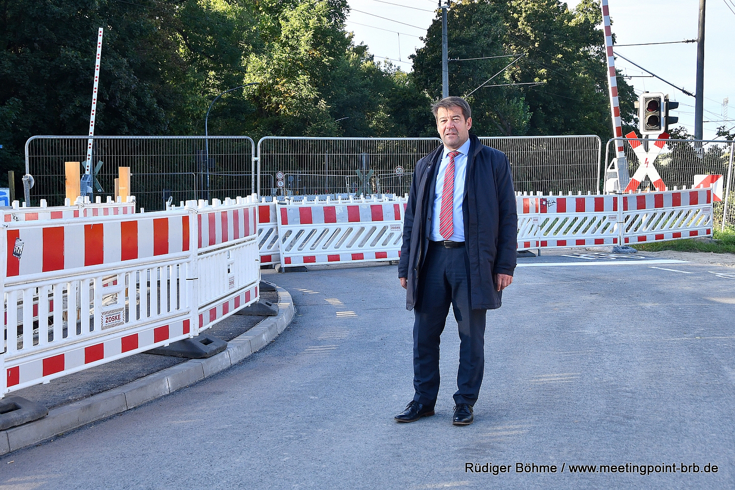 Die gute Nachricht: „Die Straße über die neue Planequerung ist freigegeben und seit Mittwochmittag geöffnet“, erklärte Oberbürgermeister Steffen Scheller am heutigen Donnerstagmorgen. Die schlechte Nachricht: Trotz der städtischen Freigabe bleibt die Querung jedoch weiterhin auf unbestimmte Zeit gesperrt, da die Deutsche Bahn den Bahnübergang bislang nicht freigegeben hat. So konnte der Oberbürgermeister heute ohne Bedenken direkt auf der neuen Verbindung stehen – die Gefahr, umgefahren zu werden, bestand nicht.
