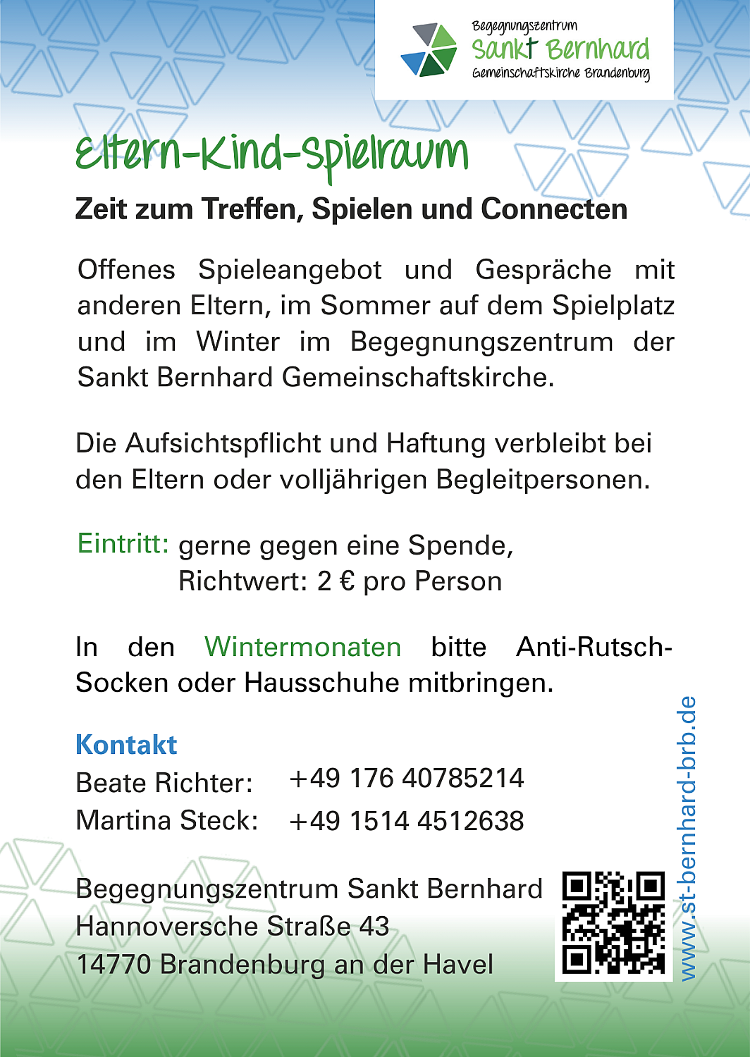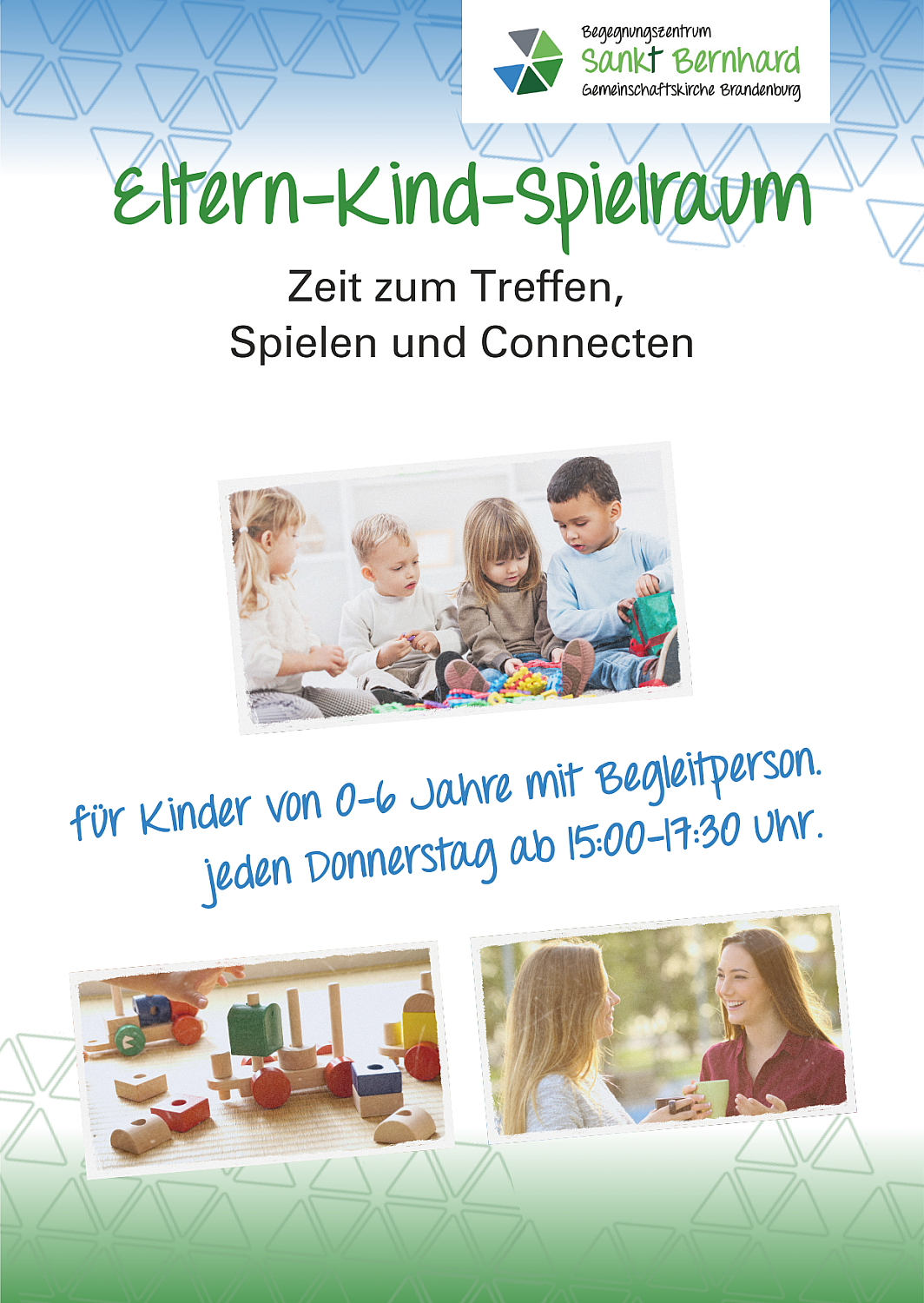 Der Eltern-Kind-Spielraum ist ein offenes Spieleangebot für Kinder von 0-6 Jahren mit Begleitperson, der wöchentlich am Donnerstag von 15 bis 17.30 Uhr stattfindet. Im Sommer ist die Gruppe auf dem Spielplatz und im Winter im Begegnungszentrum der Sankt Bernhard-Gemeinschaftskirche. Für den Eintritt wünschen sich die Veranstalter eine kleine Spende.