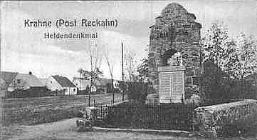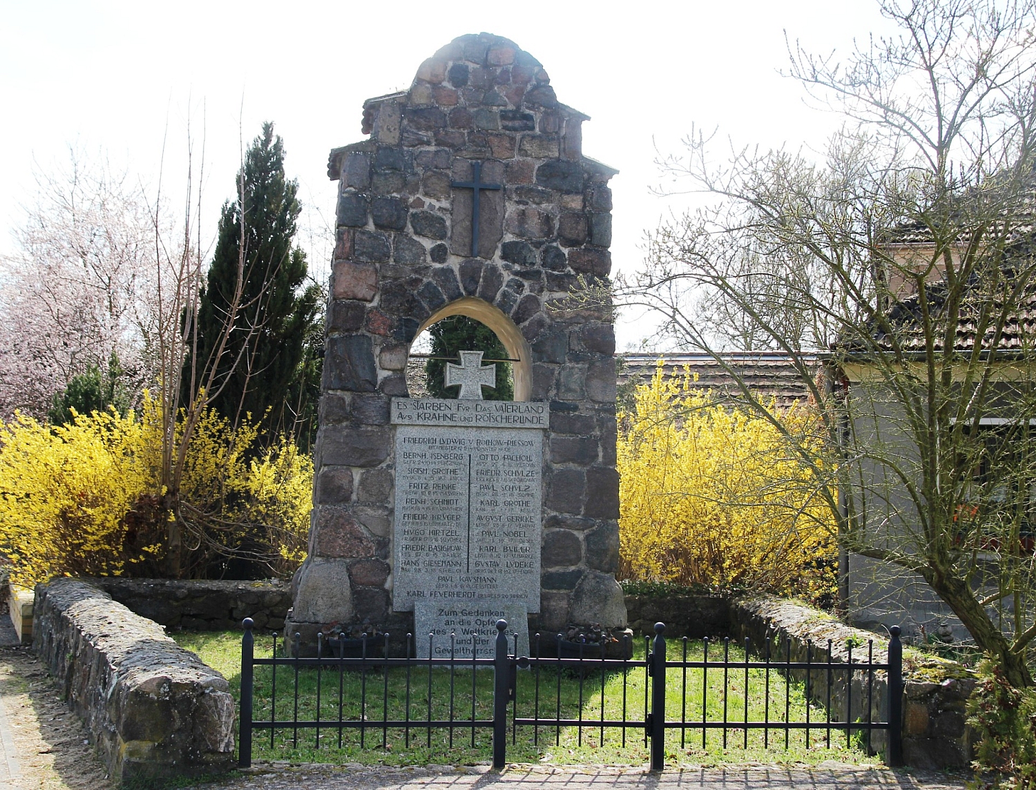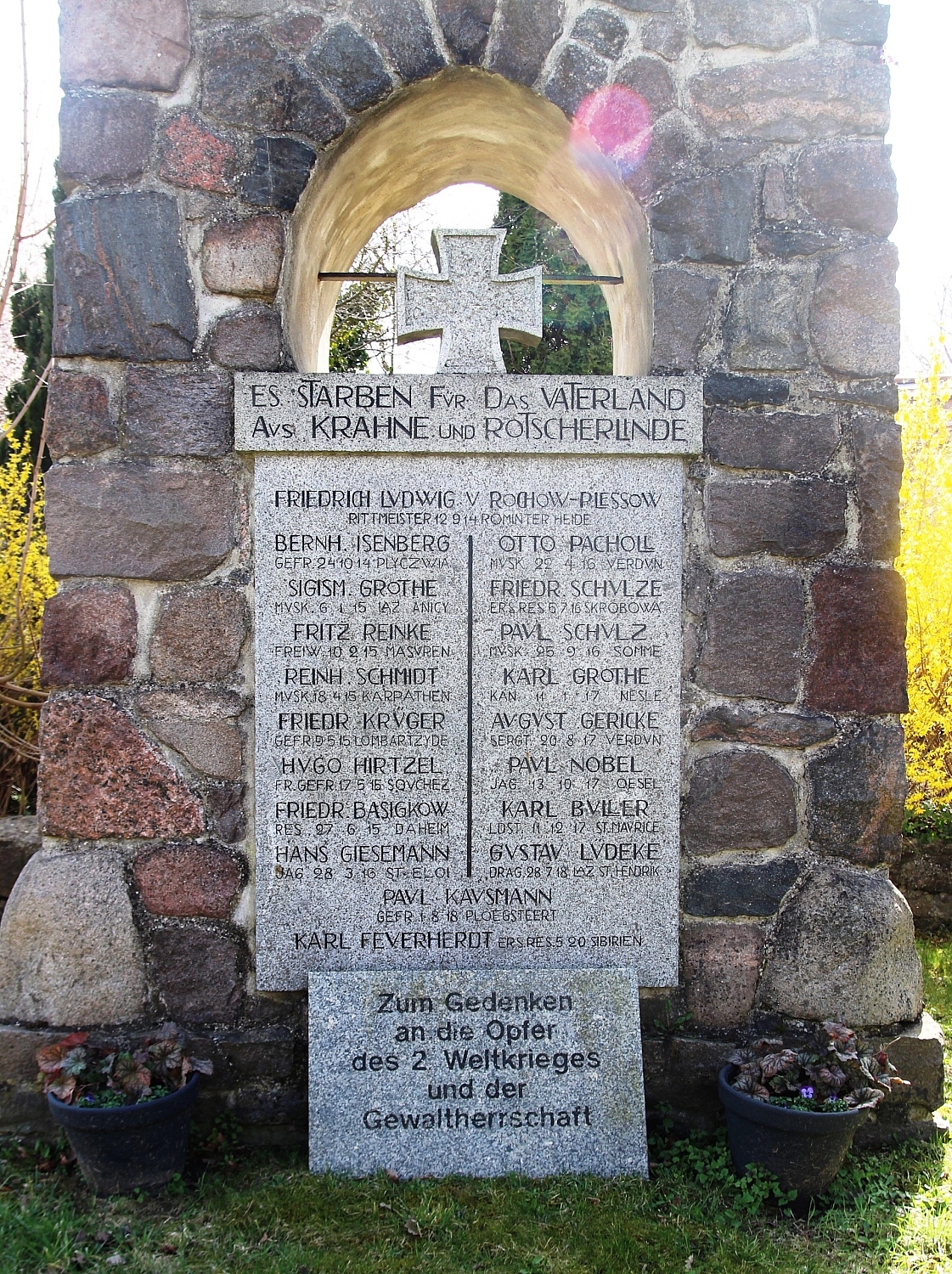 19 Krahner und Rotscherlinder verloren im 1. Weltkrieg (1914-1918) ihr Leben. Auch Krahne gedachte nach dem Krieg seiner Toten. Am 12. Juni 1921 wurde ein Denkmal eingeweiht, das durchaus auffällig ist. Verantwortlich zeichnete der damalige Regierungs- und Baurat Conrad Dammeier. Der ist übrigens auch Schöpfer der Lehniner Schule und er erneuerte die Rädeler Kirche. Berühmt wurde er jedoch durch die Umgestaltung des Berliner Lustgartens zu einem Parade- und Aufmarschplatz.