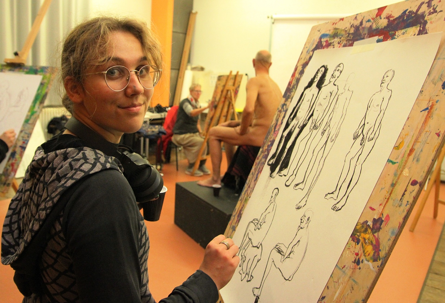 Derzeit bietet die Künstlerin jeden 1. Montag im Monat in der Wredowschule einen Kurs im Aktzeichnen an. Zum Auftakt posierte vor einem halben Dutzend Kurs-Teilnehmern ein männliches Model. Nach jeweils gut 20 Minuten gab es für den nackten Mann eine Pause, um kurz zu entspannen und einmal holte Franka Schwarz für das etwas frierende Model sogar heißen Kakao. Die Teilnehmer malten mit Kohle und Bleistift und die Bilder konnten sich am Ende durchaus sehen lassen.