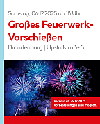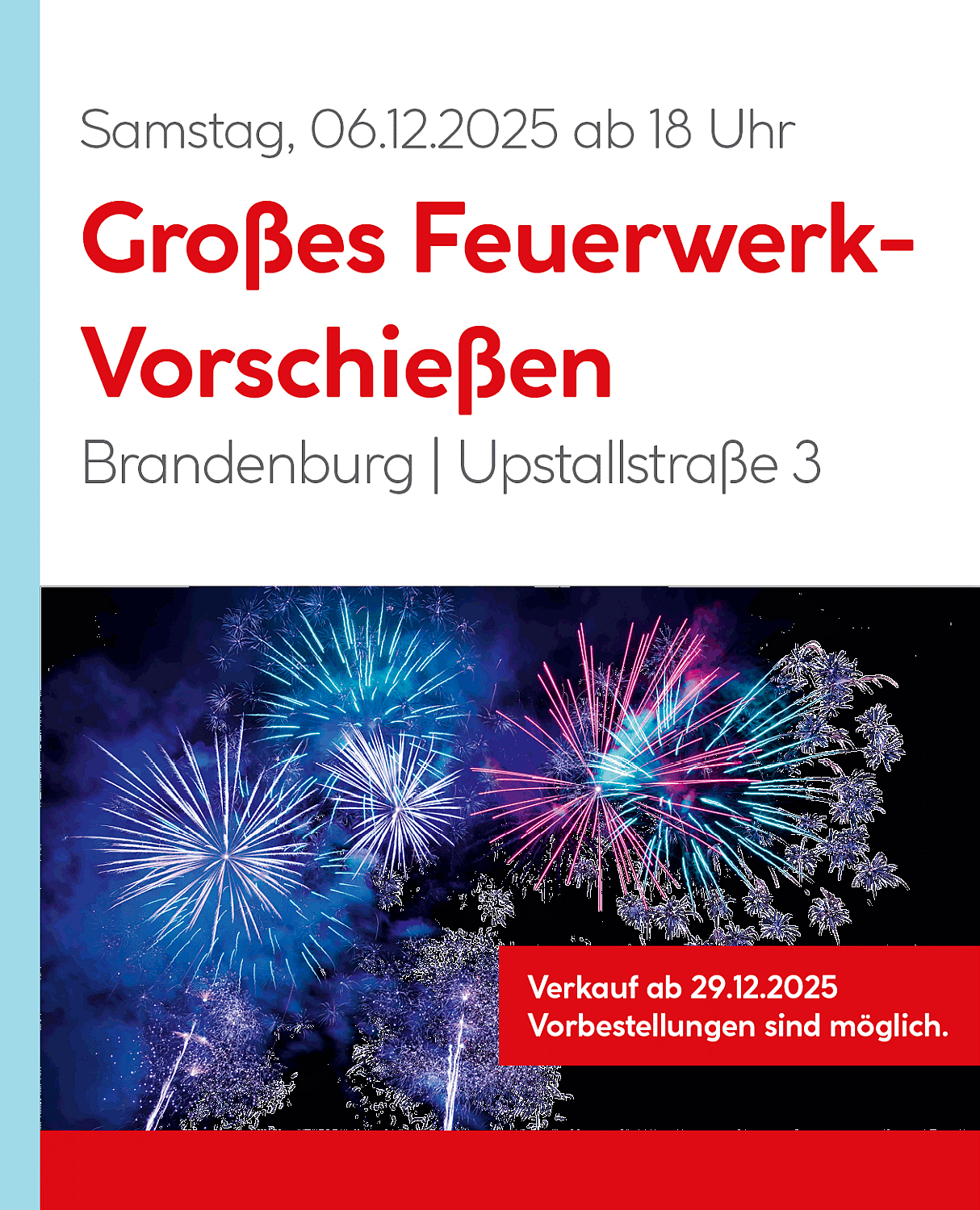 Vorgeführt werden 9 performancestarke Einzelbatterien und 3 Batterie-Verbünde mit Kalibern bis 30 mm. Im Anschluss an die Vorführung haben alle Kunden die Möglichkeit, sich die gezeigten Batterien per Vorbestellung zu sichern. Das Feuerwerk kann dann ab dem 29.12.2025 abgeholt werden.