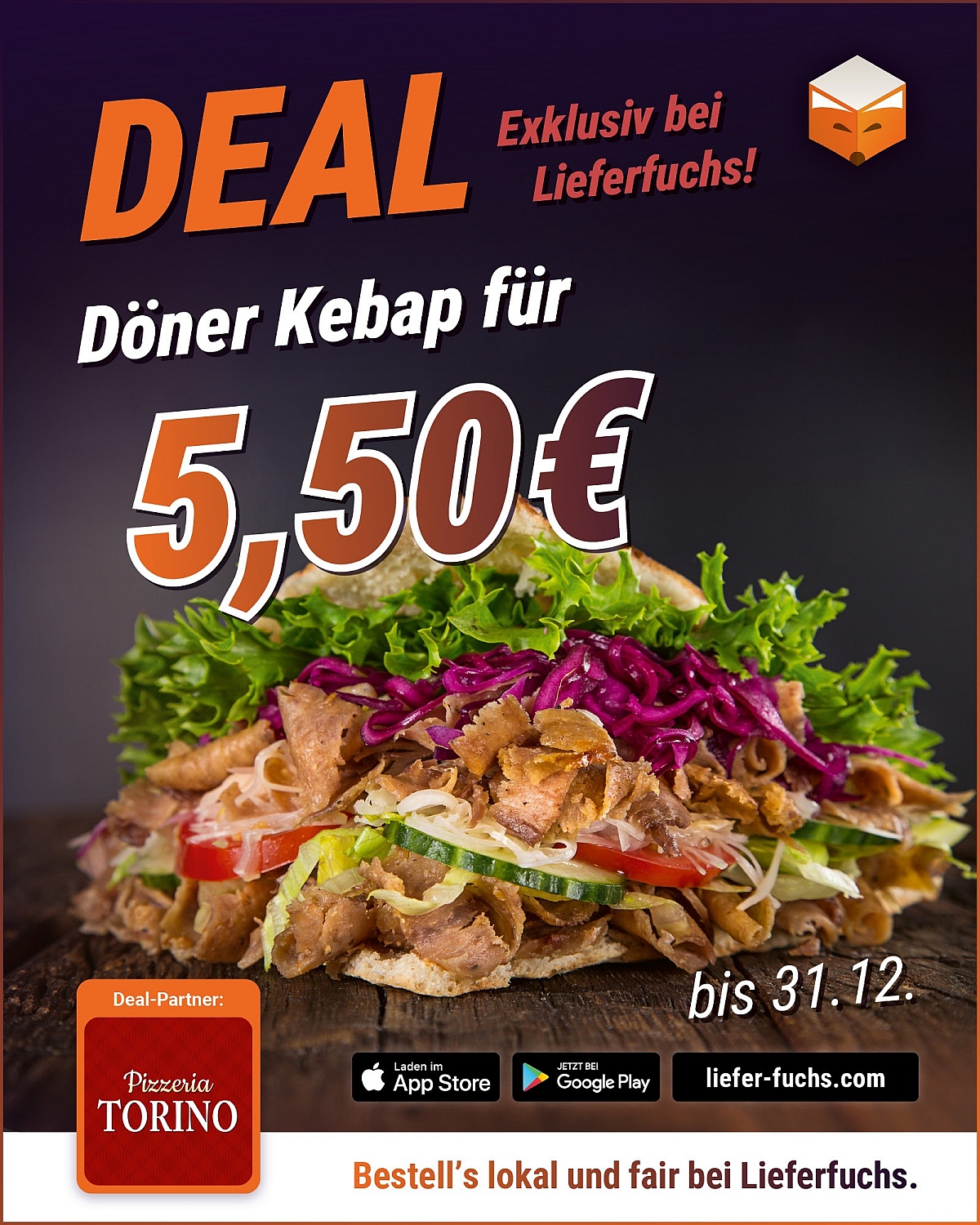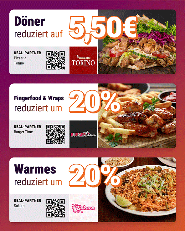 Döner für den kleinen Taler Auch diesen Monat versorgt dich Pizzeria Torino mit einem Deal für’s Herz – und den Hunger: Döner zum Freundschaftspreis von nur 5,50 €. Schnell bestellen bei