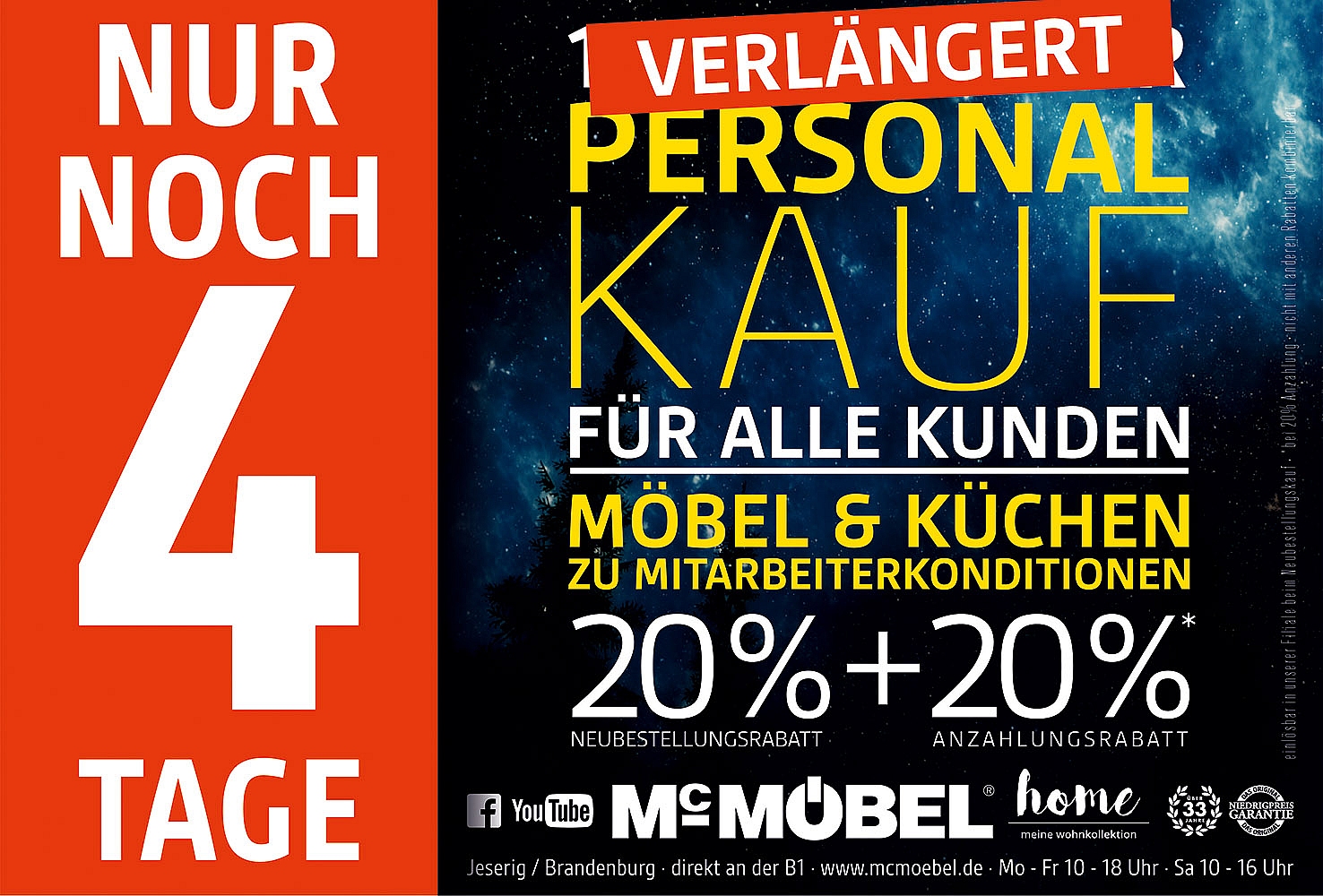 AUFGRUND GUTER RESONANZ UND ALS DANK AN UNSERE KUNDEN - WIR VERLÄNGERN - ABER NUR BIS 13. DEZEMBER PERSONALKAUFTAGE FÜR ALLE BEI McMÖBEL