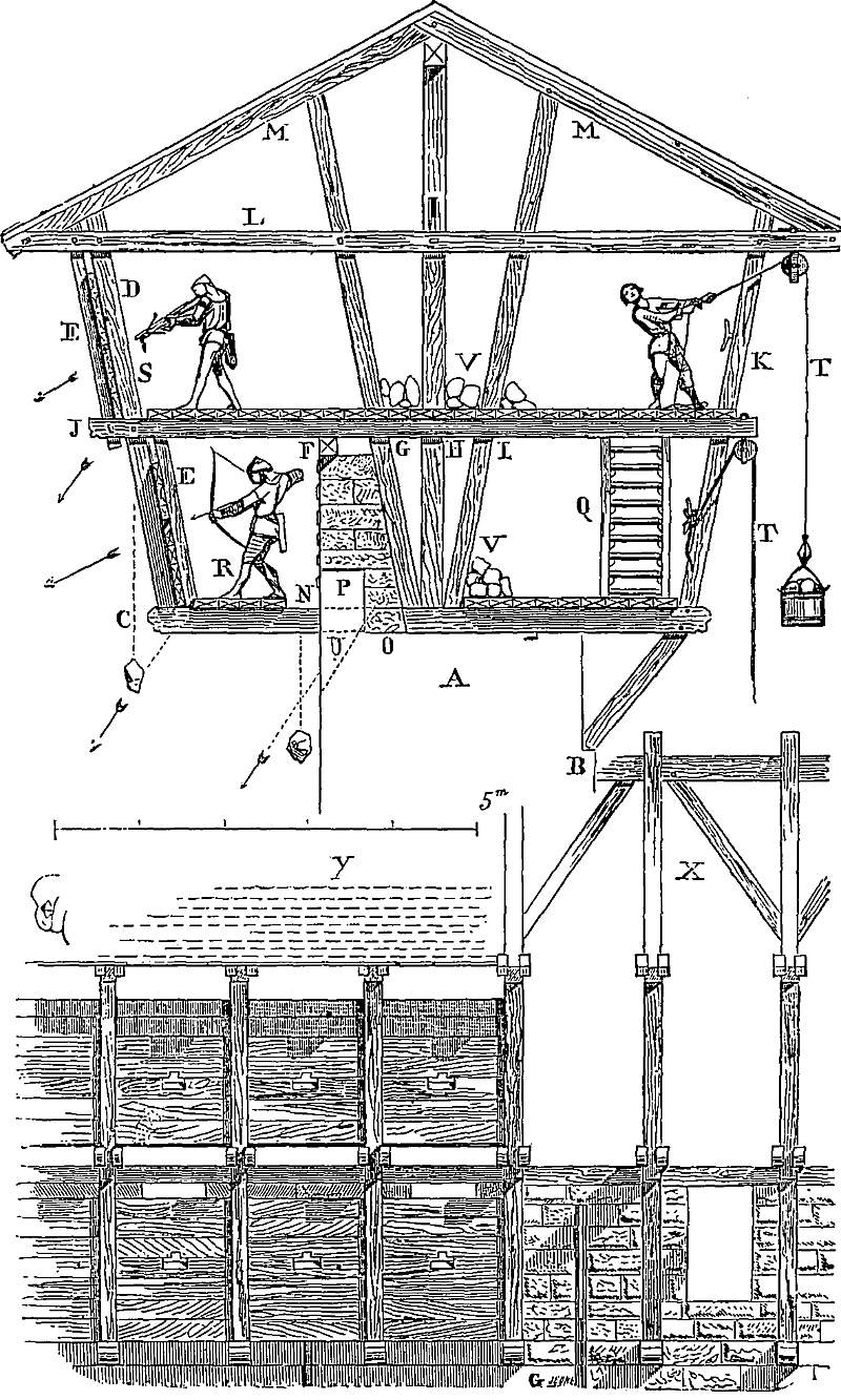 Bis um 1380 setzte man zwei weitere, beiderseits des Wappenflieses verzierte Geschosse auf, über den ein hölzerner Umgang verlief, eine sogenannte Hurde. Zur Erklärung, eine Hurde (althochdeutsch hürd „Flechtwerk aus Reisern“) ist ein im Spätmittelalter in Gebrauch gekommener nach außen vorragender hölzerner und überdachter Wehrgang auf Burg- oder Stadtmauern zur Bekämpfung von Angreifern am Mauerfuß. Der überstehende Teil des Wehrganges wurde durch hölzerne Streben abgestützt, die in Mauerlöchern verankert waren oder auf steinernen Konsolen aufsaßen.