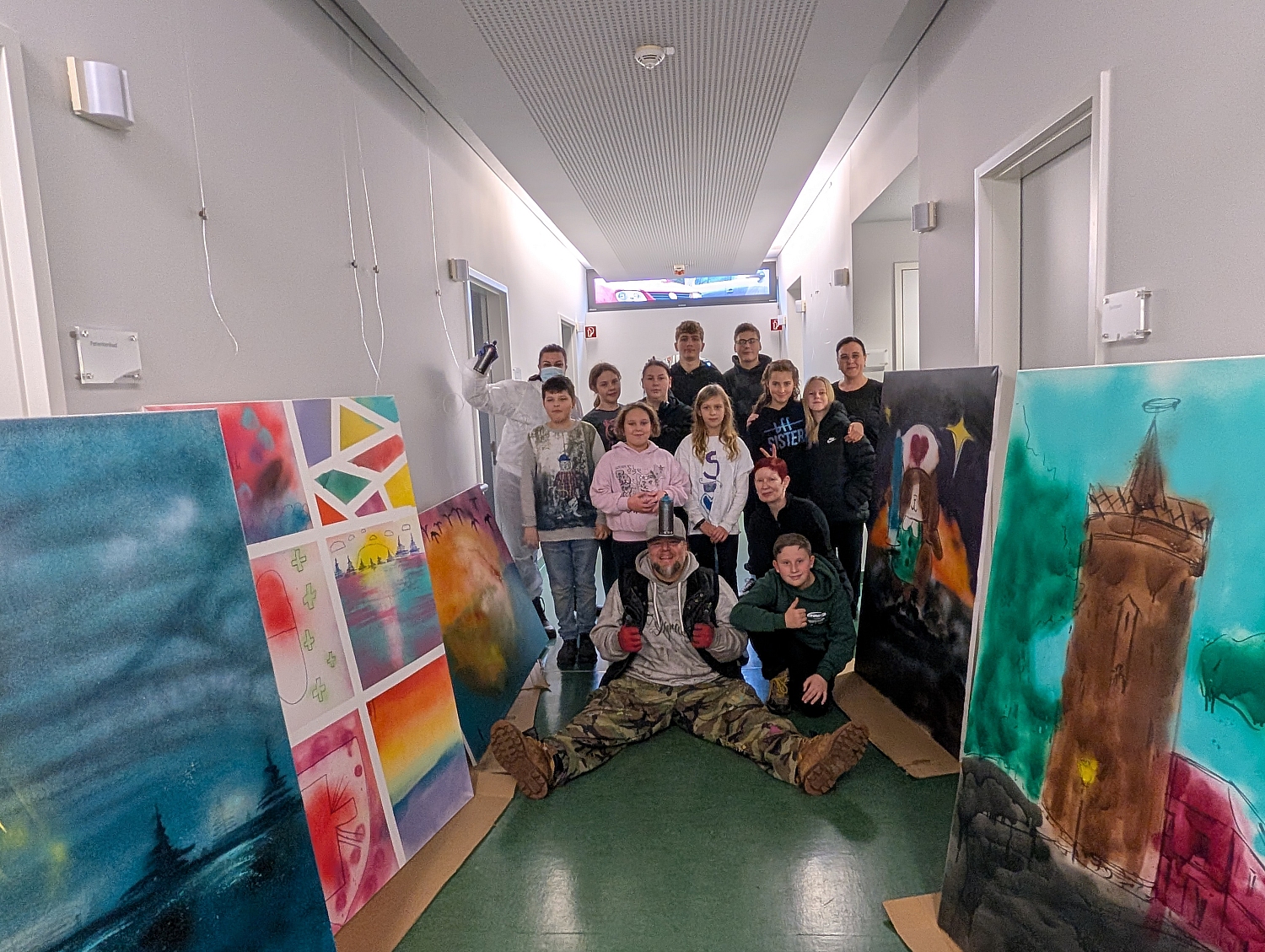 Begleitet wurden die Kinder vom Graffiti Streetart Künstler Mirco Stielow (Stylografixxx), der Erlebnispädagogin Yvonne Skoruppa sowie einem engagierten Team aus der Klinik. Mit Spraydosen und Leinwänden entstanden farbenfrohe Motive, inspiriert von Themen wie Krankenhaus, Geriatrie, Brandenburg oder ganz individuellen Lieblingsideen.