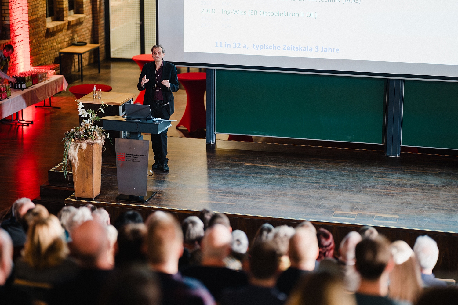 Mehr als 120 Wegbegleiter folgten der Einladung und sorgten für ein gut gefülltes Audimax. Unter den über 40 Absolventen waren sogar vier seiner allerersten Studierenden aus den 1990er-Jahren. „Prof. Vollmer hat den Fachbereich Technik und die THB insgesamt über drei Jahrzehnte geprägt“, sagte Prof. Andreas Jechow, der Dekan des Fachbereichs Technik, in seinem Grußwort. Auch er hat einst als Student in Vorlesungen von Michael Vollmer gesessen und miterlebt, wie dieser mit großer Leidenschaft physikalische Phänomene mithilfe von Experimenten erklärte. „Er war ein Meister darin, Brücken zwischen Theorie und Praxis, zwischen Hochschule und Gesellschaft zu bauen.“